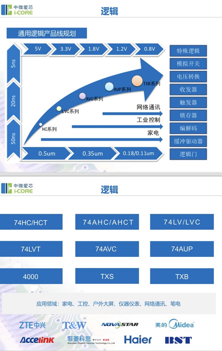 中微爱芯是国内最早从事逻辑芯片研发和生产的芯片设计公司,亦是国内逻辑芯片型号最齐全,供应链最稳定的芯片品牌,目前已量产的型号超过300种,包括74HC/HCT、74AHC/AHCT、74LV/LVC、74LVT、74AVC、74AUP、电平转换系列、模拟开关、4000系列等。